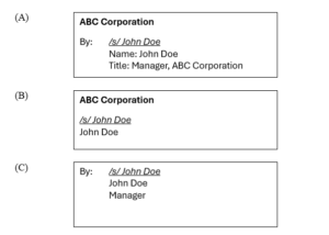 The three signature blocks may appear similar, but the legal consequences differ significantly. In signature block (A), the signatory stated that ABC Corporation’s execution was “By” the agent and listed his office within the company. Signature block (A) unambiguously shows that manager John Doe is acting on behalf of ABC Corporation, retaining the limited liability afforded to corporate officers.1